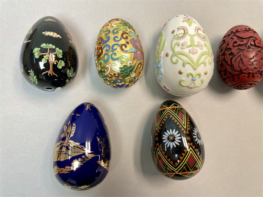 This series was issued by Franklin Mint, intended to showcase the worldwide variety of collectible eggs.  This lot has 9 different ones: crystal, cloisonne, cinnabar style, Wedgwood style, others.  Good condition.