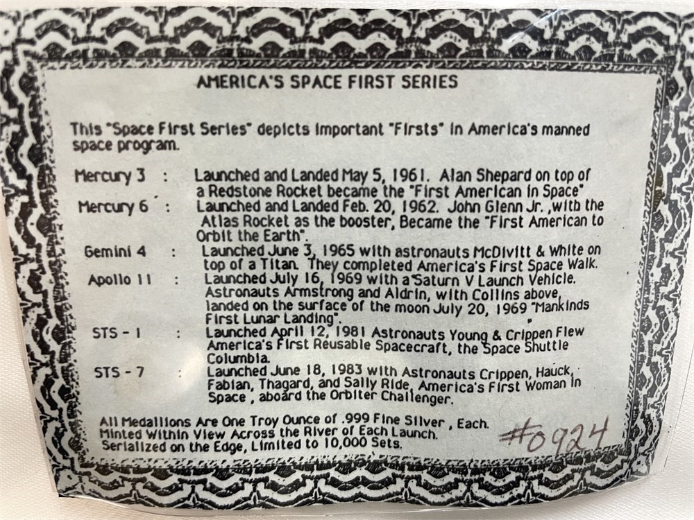 A boxed set of 6 interesting space program medallions; each is 1 troy ounce of .999 fine silver.  Limited edition, numbered 0924/10,000.   Themes include Apollo, Mercury, Gemini, Columbia, Challenger, John Glenn, Alan Shepard, first space walk.  A rare set that we have not seen before.