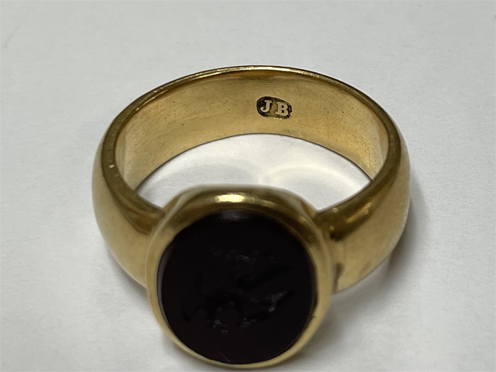 A late 18th century or early 19th century men's ring featuring an intaglio carved eagle on carnelian stone.  Maker's mark is JB.  This ring tests at 18K gold.  Size 8.