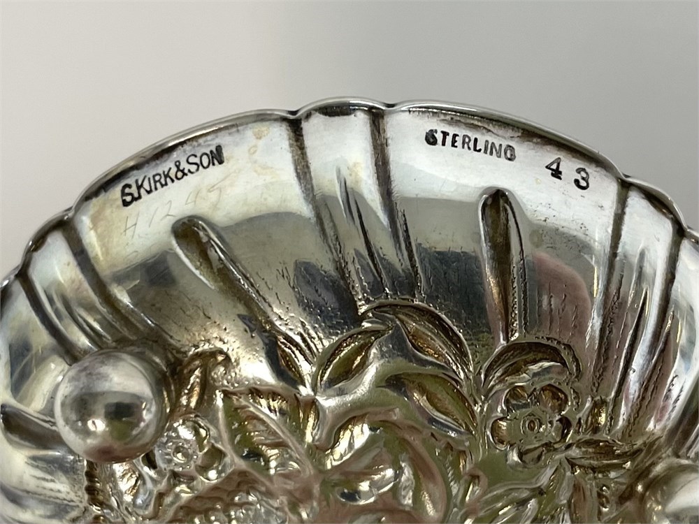 A set of six footed nut dishes by S. Kirk & Son, also marked Sterling / 43.  About 2 1/2" diameter, with ball feet, good condition, a pretty pattern with fruits and florals.