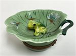 Both for the bid.  The lily pad is repairedbut it's hard to tell especially from the top.  Really a cute box with 3D frog and painted dragonflies.  Also a little amphora jar, good condition.  Both pieces marked the same, Limoges France, Peint Main.