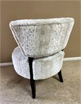 A neutral-colored modern chair in good condition.  Upholstered with soft plush fabric that has a subdued animal print.  From Pier One.