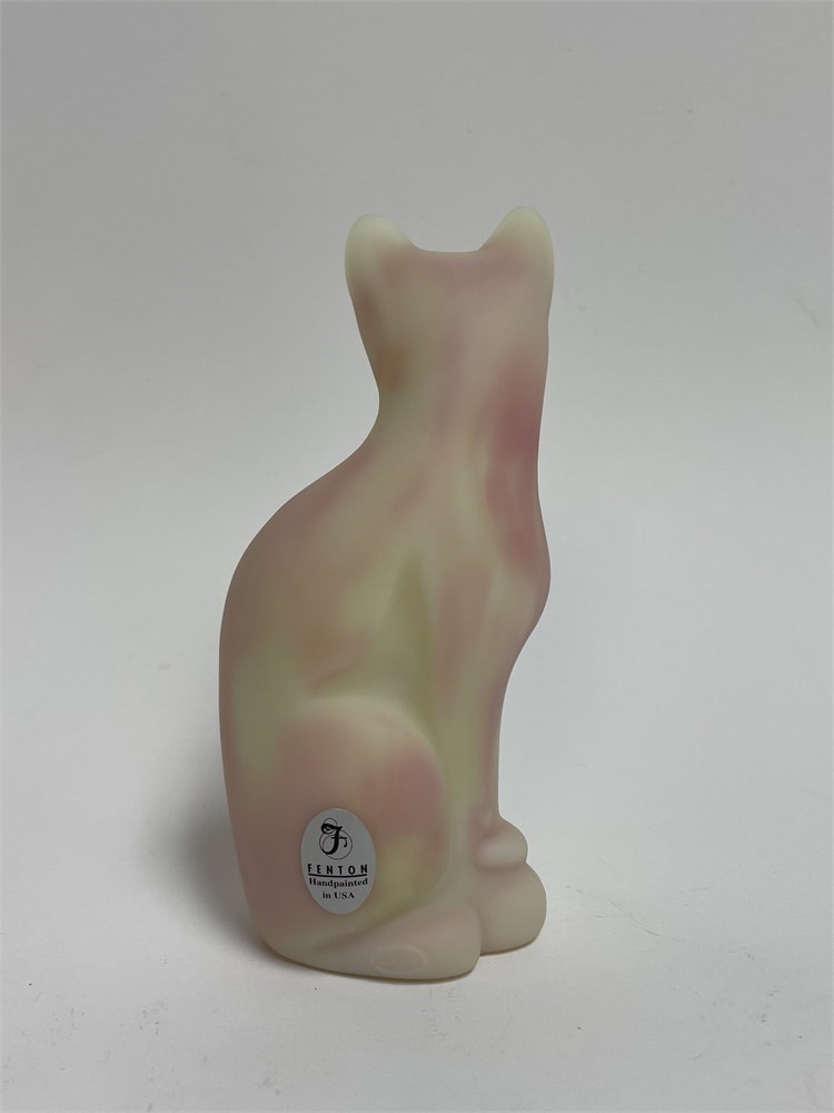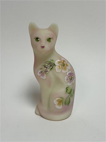 A beautiful Burmese (uranium) glass cat, hand painted and signed by the artist, A. Farley.  Numbered 2857 and made to honor Bill Fenton.  No chips or cracks.  About 5" tall.  She glows brightly under blacklight.