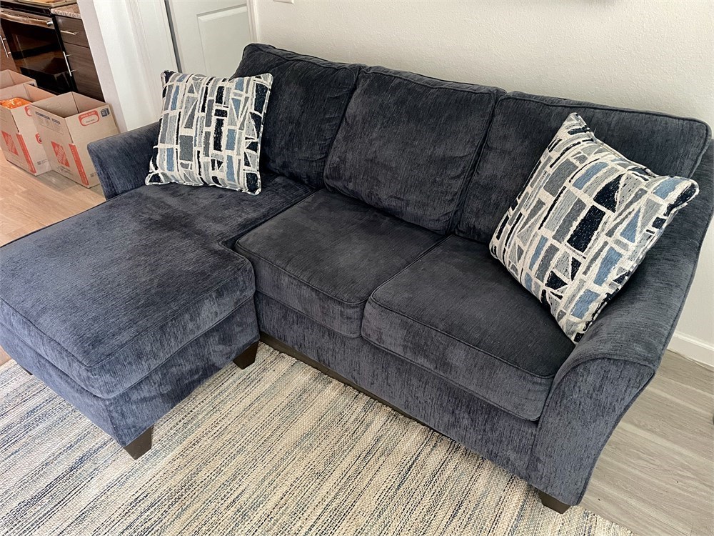 A small (apartment sized) sofa with modern-style ottoman extension.  One of the cushions covers the ottoman, which is detached and can be used on either end by flipping the cushions.  The color is a light hue of navy blue and the fabric is similar to corduroy texture.  Good condition; pillows included.