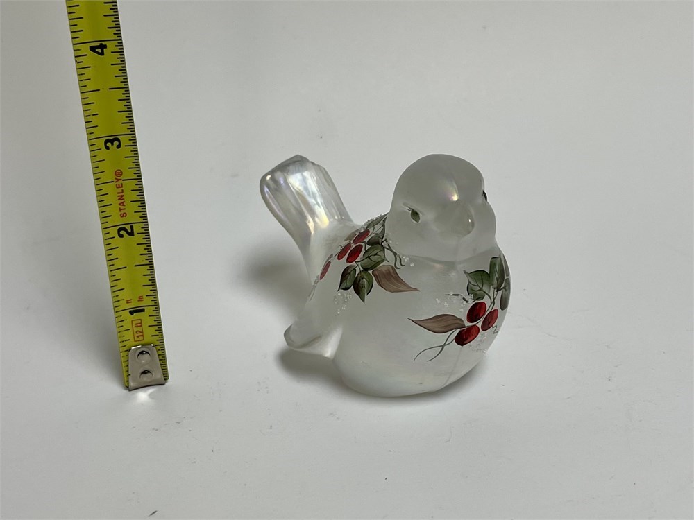 A pretty bird, handpainted with berries, artist signed D. Robinson.  Good condition, no damage.  The glass is lightly iridescent.