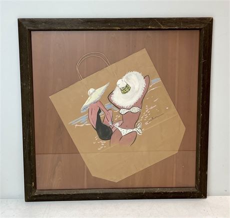 A cool piece of artwork for a Florida home.  It's an original painting on a paper shopping bag, framed under glass.  It appears to be signed Paulson, but see the photo, we could have the artist's name wrong.  Good condition.
