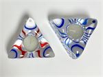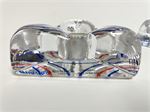 2 glass triangular candleholders, signed UHV for Ulrica Hydman Vallien.  They're painted on the bottom, and the painting shows and reflects in the glass to make blue and red/blue waves.  Good condition, no damage.