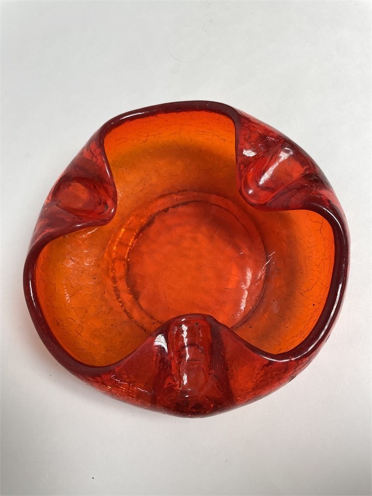 A red/orange mid-century crackle glass ashtray, big and chunky, about 7" diameter.  Good condition, no mark found.