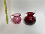Hand blown ruby red short vase with clear handles; a pink/cranberry creamer; a 1939 souvenir cup; 2 amethyst Bohemian shot glasses; a souvenir stemmed glass; and a red/frosted vase with bird design.  No chips or cracks, maybe dusty though! :)