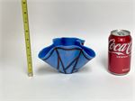 Slightly iridescent art glass bowl with bold stripes.  No signature found.  No damage.  About 5" tall.
