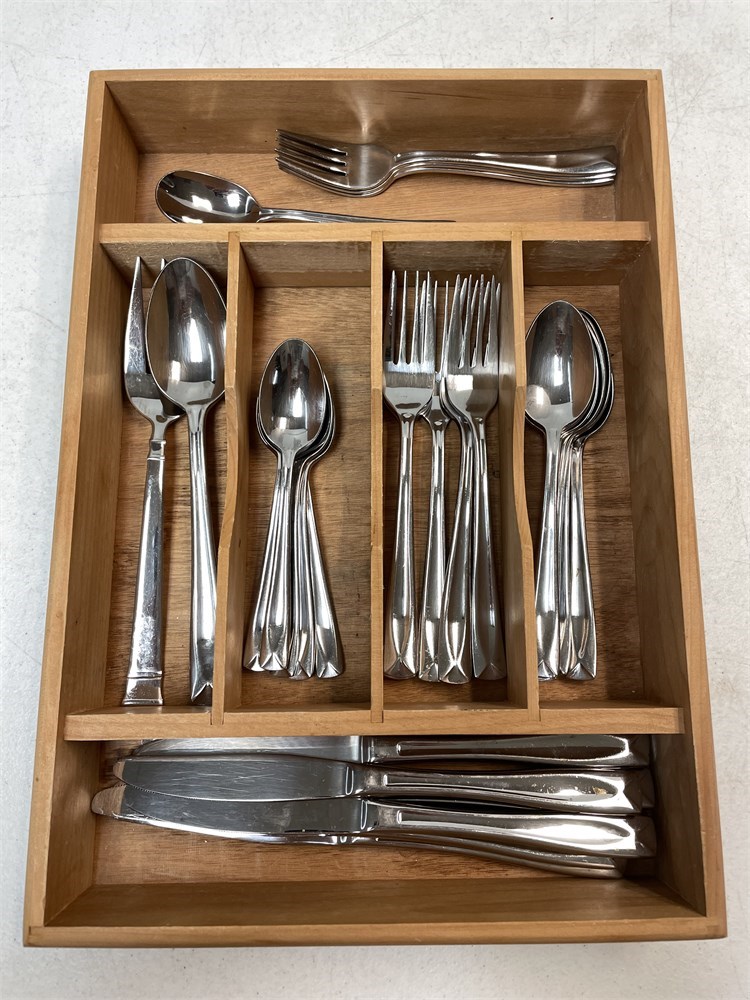 At least 8 of each fork/knife/spoon, although some are smaller or larger.  Just something useful for your home, and they are good heavy quality, by Oneida.  Wood organizer included.