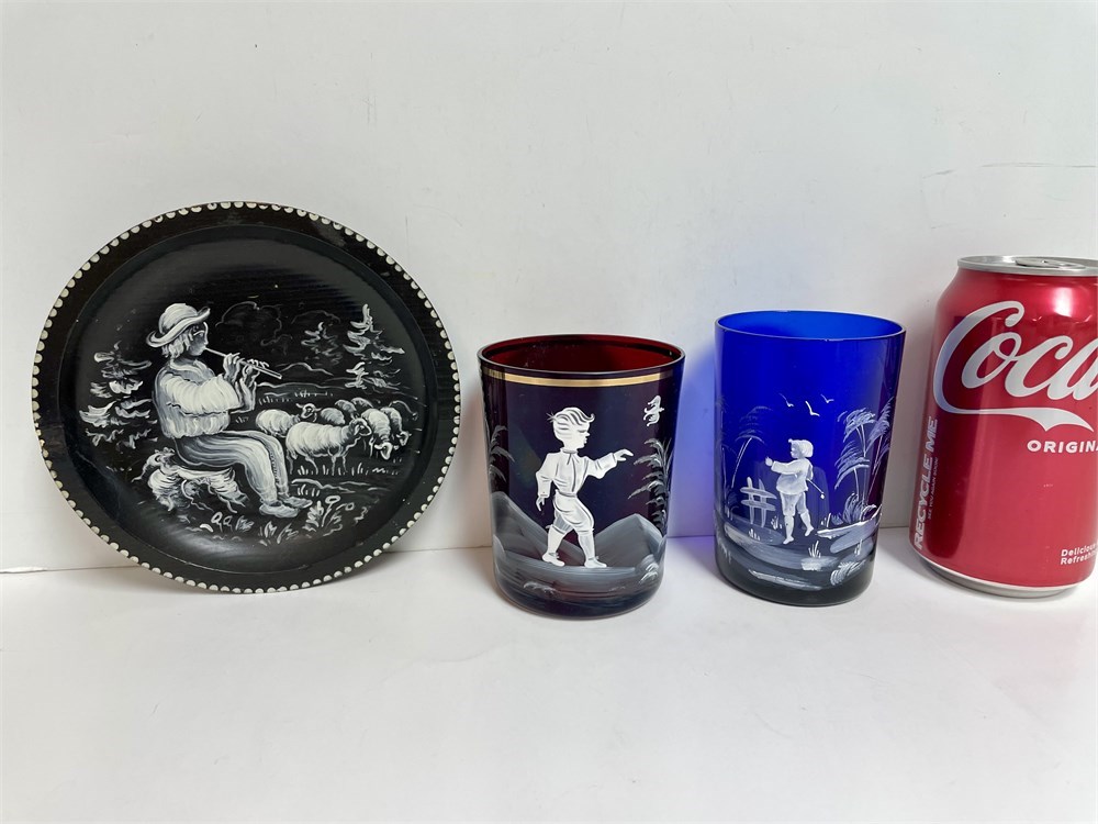 5 pieces in good condition.  The plate is wood and the others are glass.  The bells are probably Fenton glass, but unmarked other than the artist's signature.  The small glasses are cobalt and red colors.