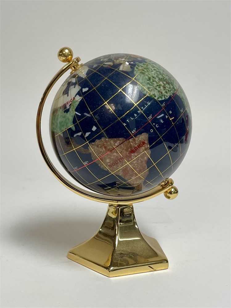 This world globe appears to be made from assorted stones, but it is lightweight, so some may be faux.  The abalone, for example, looks real though.  Anyway, it's an attractive item for your desktop, and about 5.5" tall.