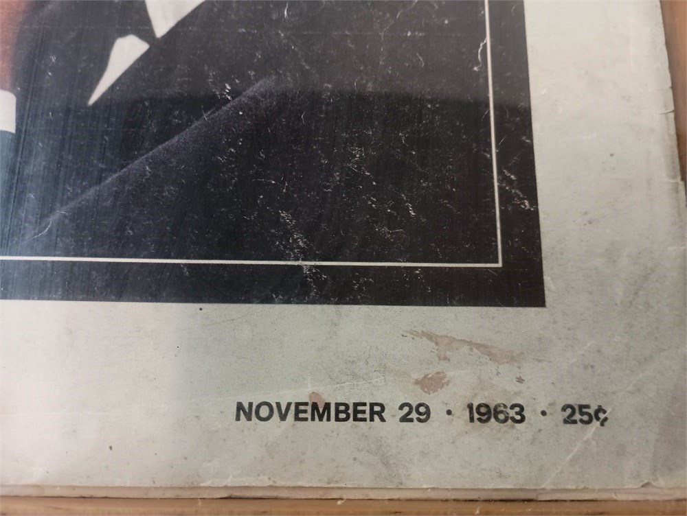 The original Life magazine (Nov 29, 1963) is in a hanging shadow box frame.  The Daily Plaza Memorial magazine is modern.