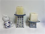 Blue and white group includes a nice cut-to-clear glass vase.  Cute Asian style candleholders and candle bear.  The centerpiece is repaired on the corner; everything else ok.