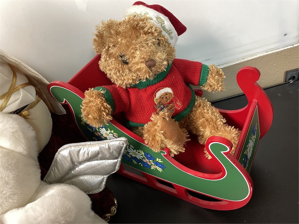 Stuffed bears, mostly Christmas/winter themed or at least Christmas colors.  Assorted collectible brands.