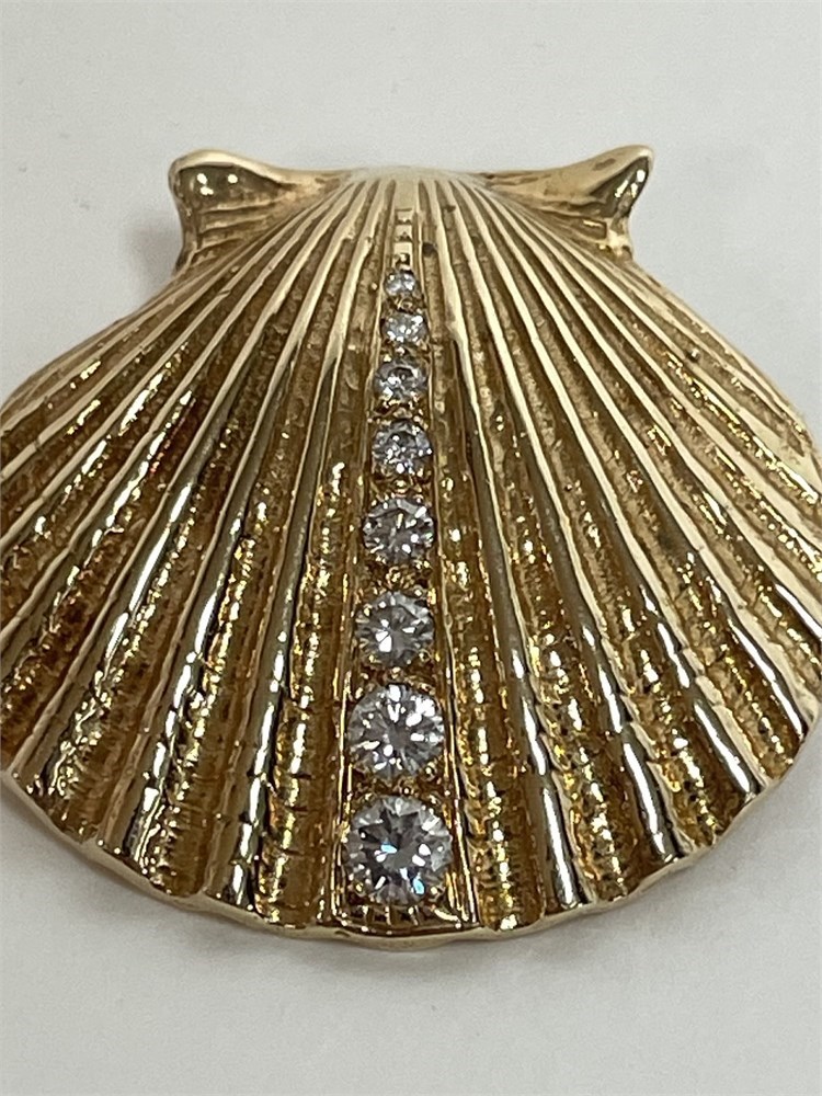 You'll love this 14K yellow gold seashell pendant, ready to wear on almost any chain.  It's set with an elegant row of eight genuine diamonds, graduated in size up to 1/4 carat (estimated).  Nothing skimpy about this eye-catching pendant!