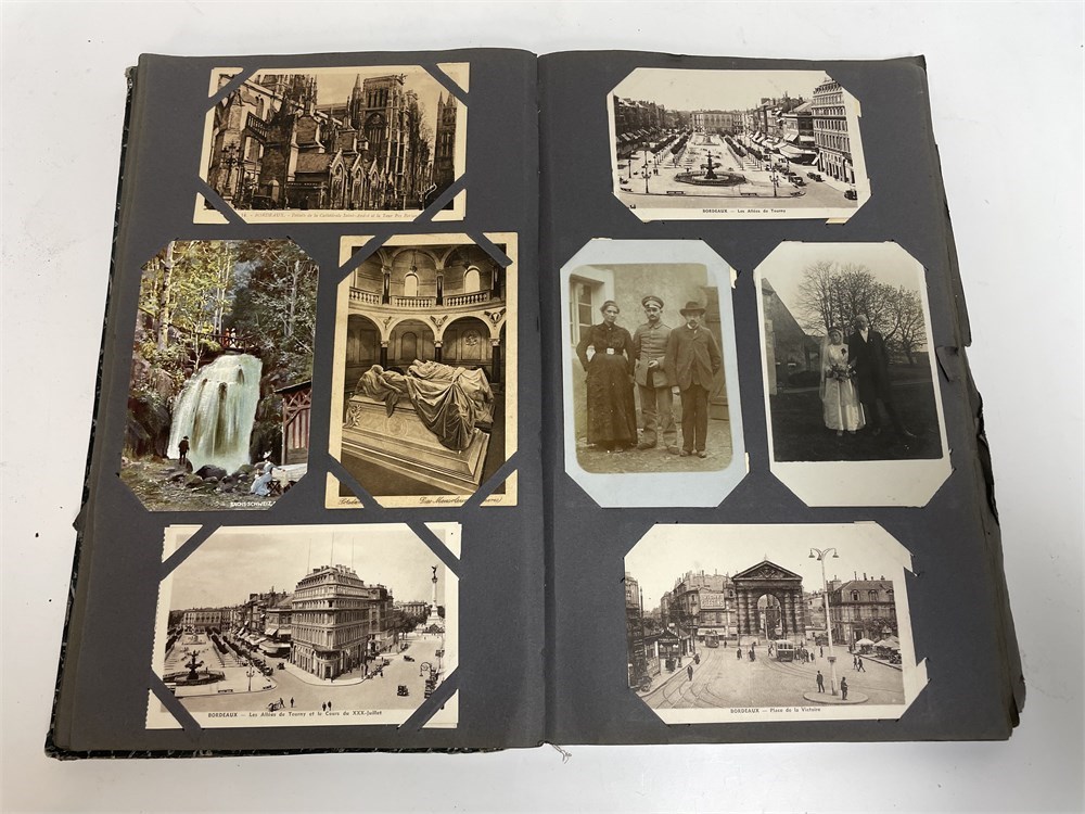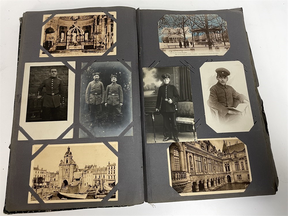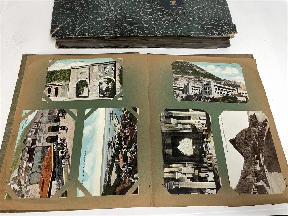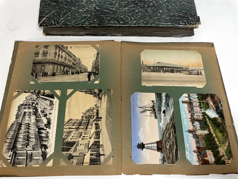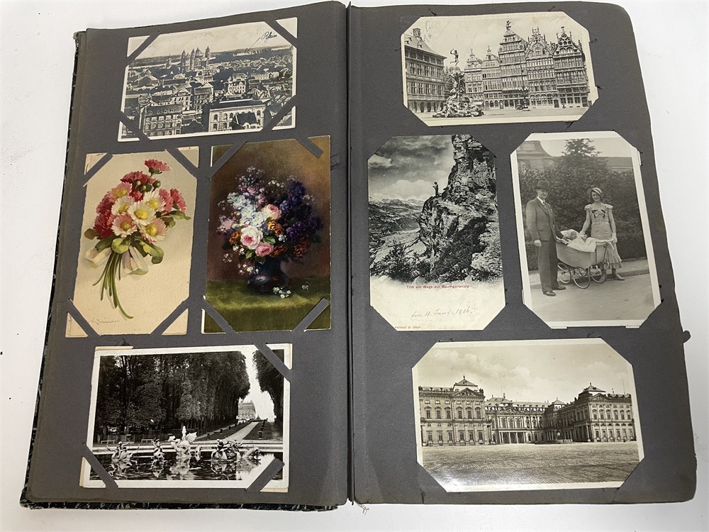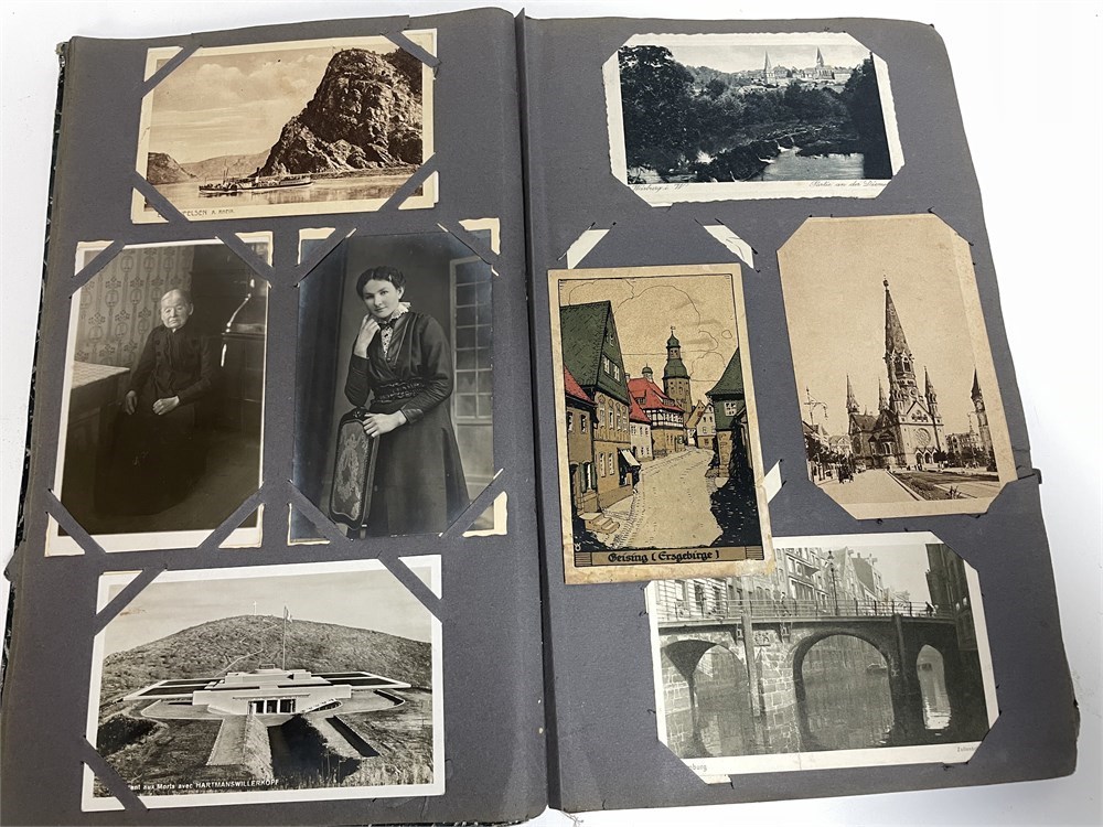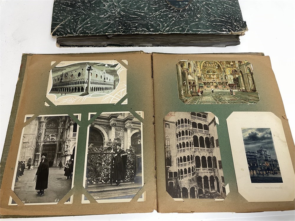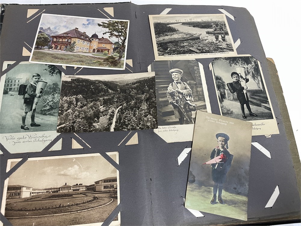 The green one is "mostly" full and has several military cards as well as others, landmarks, etc., mostly 1900-1920 I think.  The other album has mostly scenic cards and many of them are closer to mid-century.  Germany and other subjects.