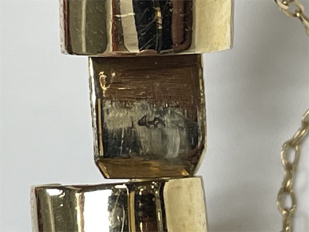 A vintage Gump's bangle bracelet, black jade, with yellow gold hinge and fastener, plus a safety chain.  The gold has an engraved design; it's a pretty piece.  This was probably a favorite item and worn more often; the clasp is repaired.  (Clasp works.)  Marked 14K.  Original box included also.