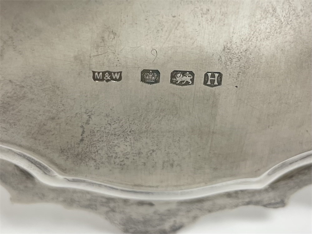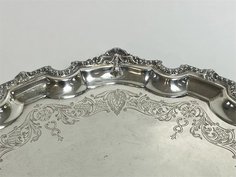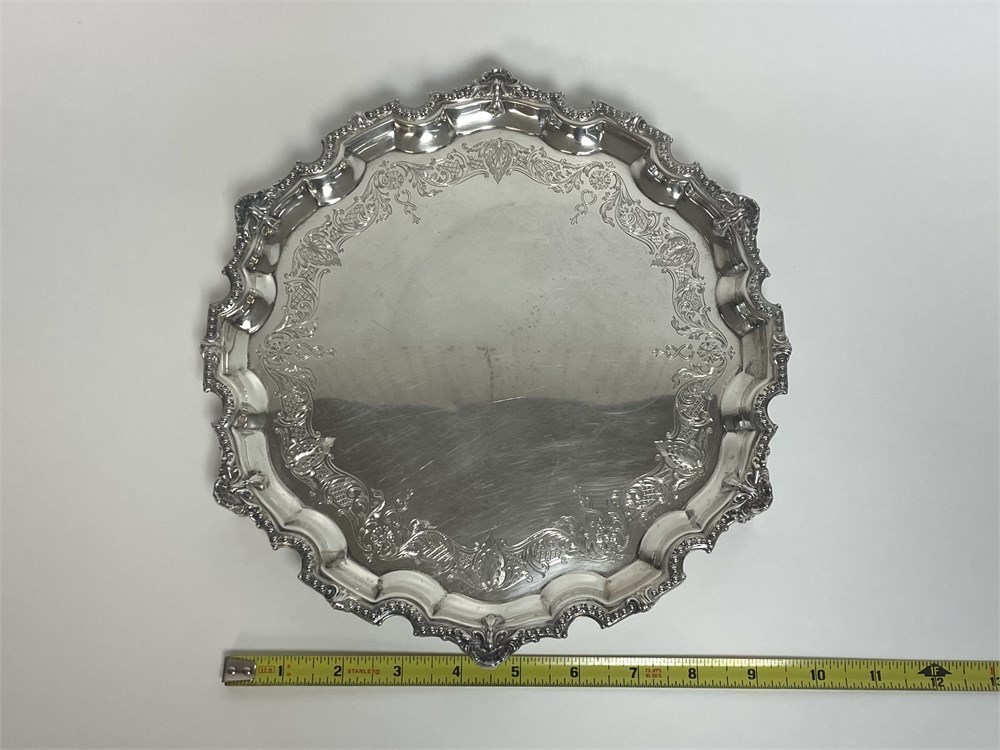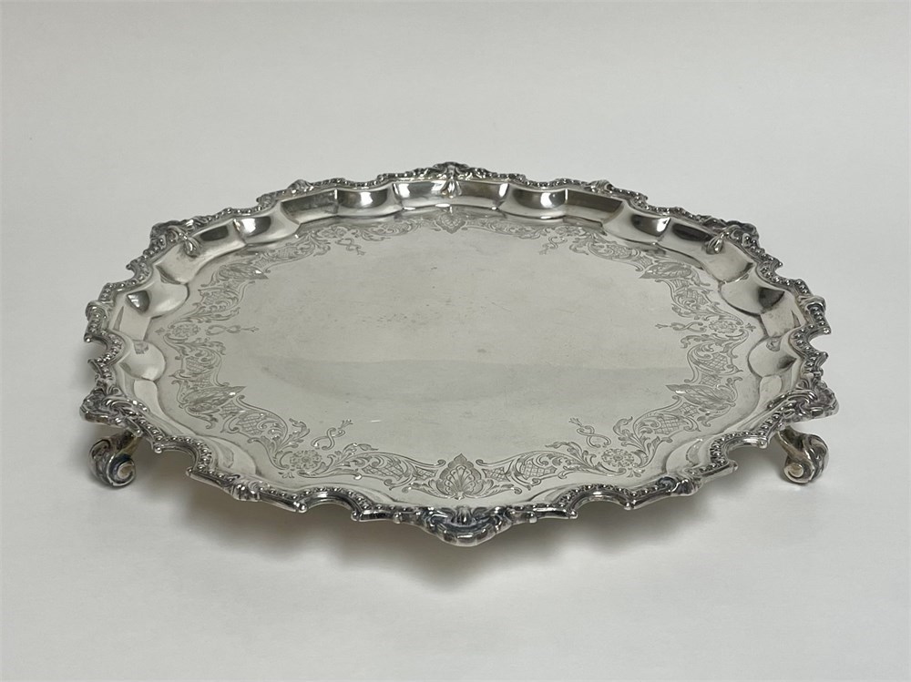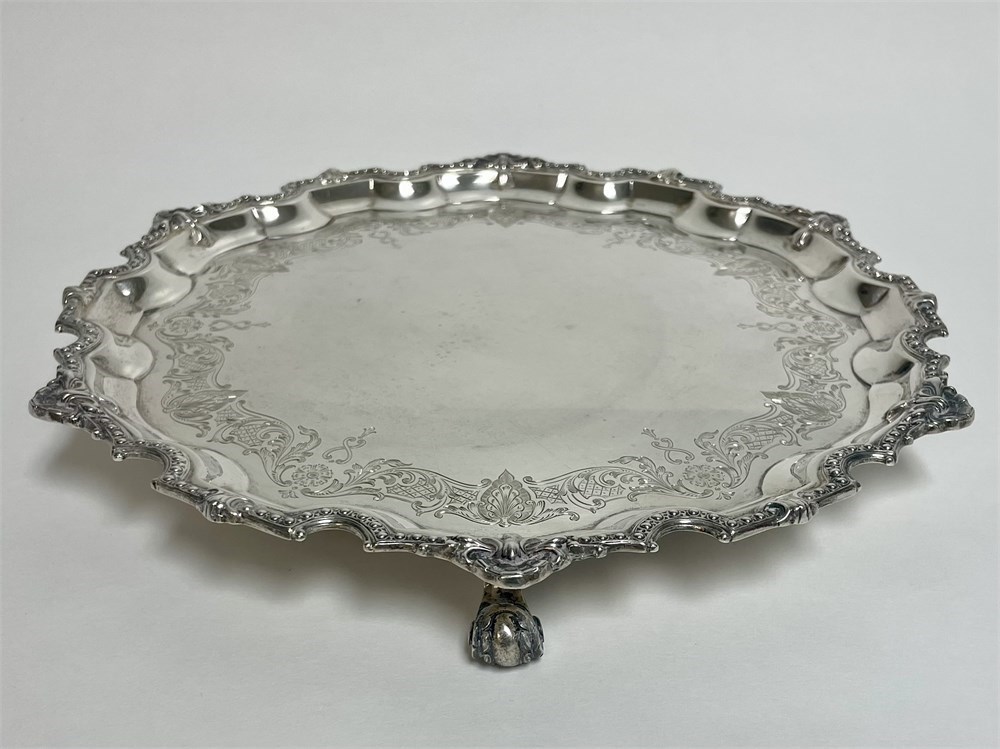 A very nice Georgian style three-footed silver salver with engraved decoration and pie crust edge.  Not monogrammed.  Hallmarked as sterling silver; by Mappin & Webb, Sheffield, England.  About 11" at widest point.
