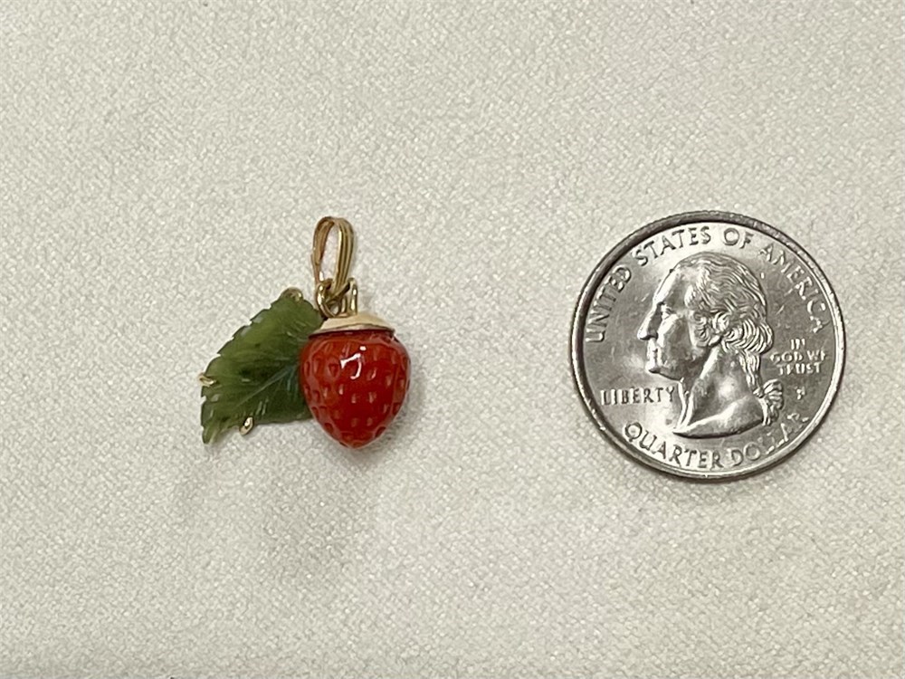 So delightful!  This lot has *two* pairs of strawberry earrings, plus a pendant.  They're vintage 14K gold (all marked), with the fruits and leaves carved from red coral and jade.  They're dainty and small, the earrings are two different styles (both screwback), and everything is in good condition.  Also - they're simply adorable - so bid while you have a chance. :)