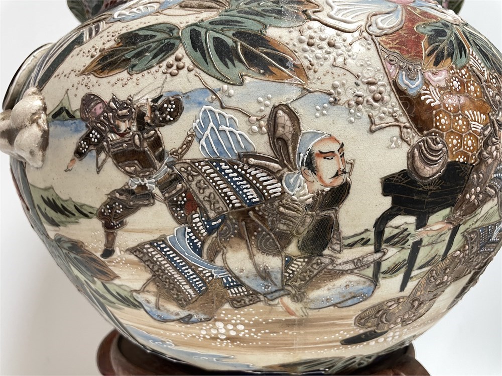 A highly decorated earthenware fishbowl planter, on stand.  Hand painted and including raised designs, dimensional bows, detailed warrior figures, florals, and an ornate top border.  This estate item may have been exposed to weather, and was apparently used as a plant container, so please notice the condition.  Specifically, there are areas of dark (almost purple) crazing, and the interior is dirty.  No chips or cracks found, though.  Stand included.