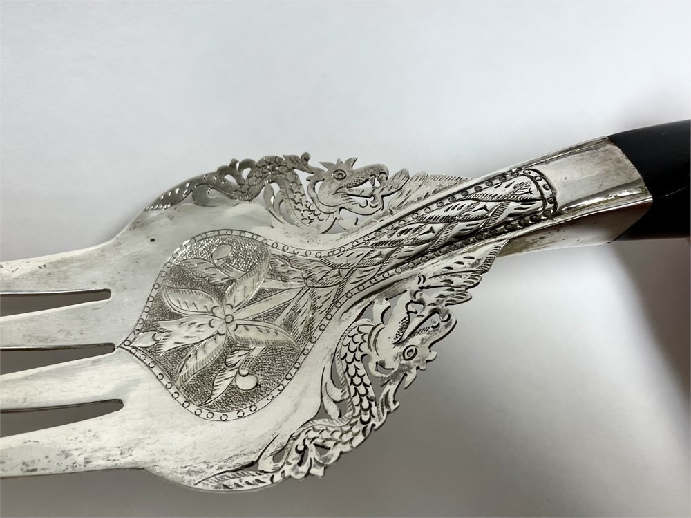 Ornately etched silver utensils featuring dragons and flora.  The bold handles are an unidentified natural material, likely horn.  9" long, marked as pictured.  Silver content (fineness) unknown.
