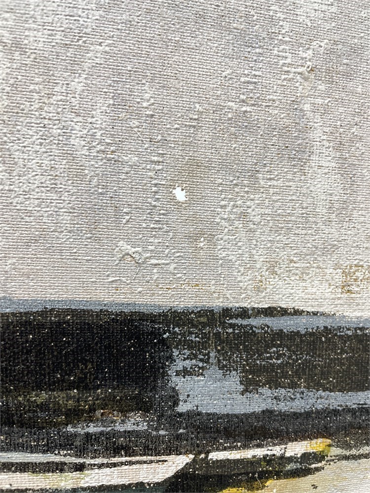 Joseph Rovers (Dutch, 1893-1976), two mid-century seascapes of boats in harbor.  We believe these are embellished serigraphs; they do look like paintings.  The original information has been saved on the back by a framing shop; the info refers to these pieces as studio editions by Van Amstel Co.  The canvases are showing some thinness/age and have a few small holes.