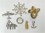 The best one here is the bright and colorful strawberry pin, no signature found.  Various other glitzy pieces too - an airplane, a grand piano, a big snowflake, and more.  See photos for the variety.