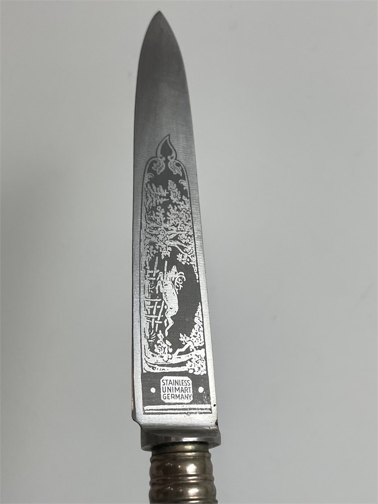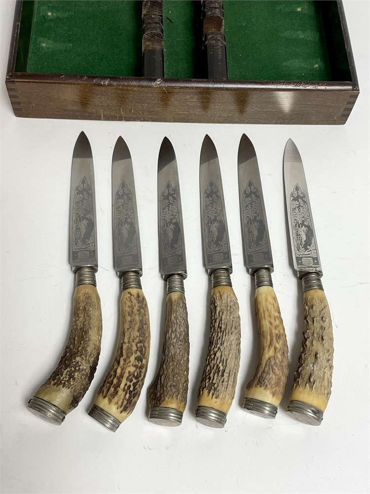 6 vintage staghorn handle knives with blades engraved with a jumping buck deer.  Marked: Stainless, Unimart, Germany.  Holder box included.