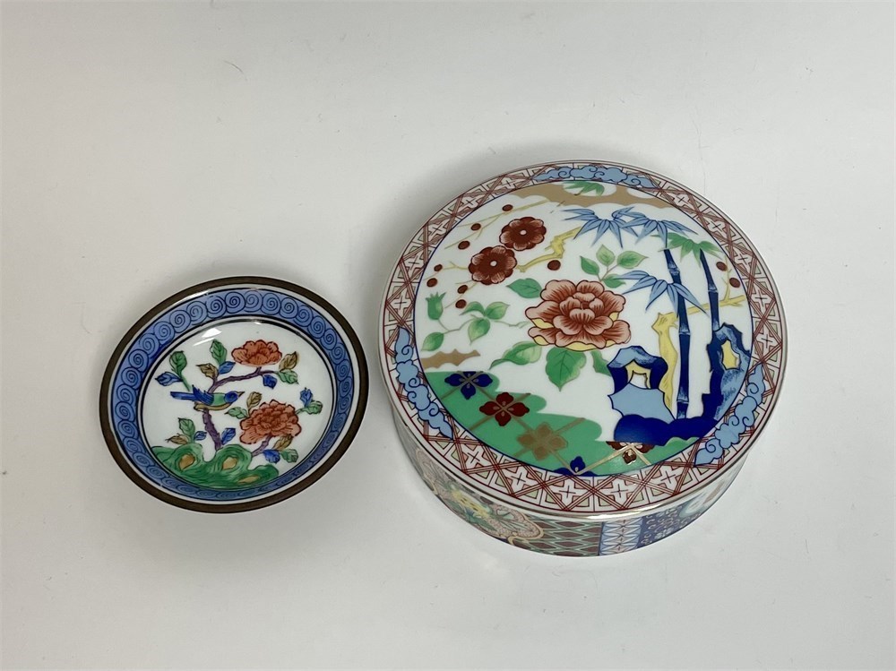 A nice porcelain dresser box, about 5.5" diameter, Japanese Imari Ware by Miyako.  Also a cute little dish that coordinates with it, with red A.C.F. maker stamp, brass housing.  Both in good condition.