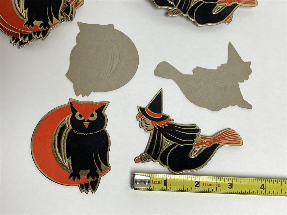 Gold foil paper appliques for Halloween decorating.  Die cut shapes of owls and witches, 25 of each.