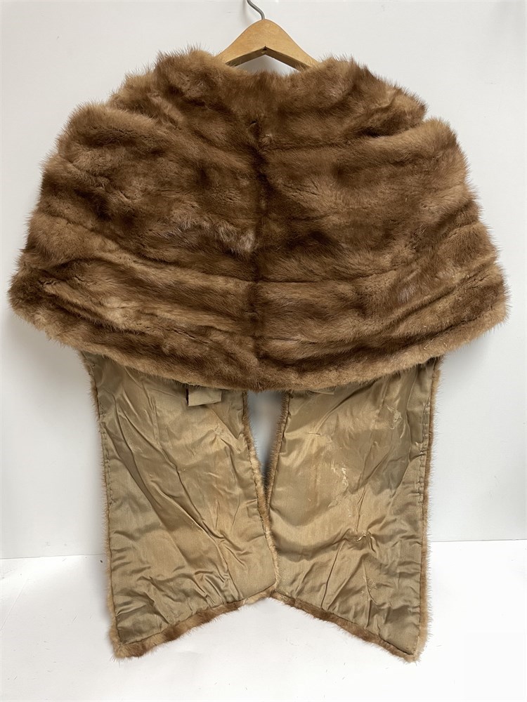 The small collar or neck warmer has pom-pom ends and a tag from Denmark.  The fur stole or wrap is showing some age to the lining and the fur also.  There are "pockets" at the shoulders presumably to help it fit better.  Maker unknown, but the lining has a Magic Carpet logo.