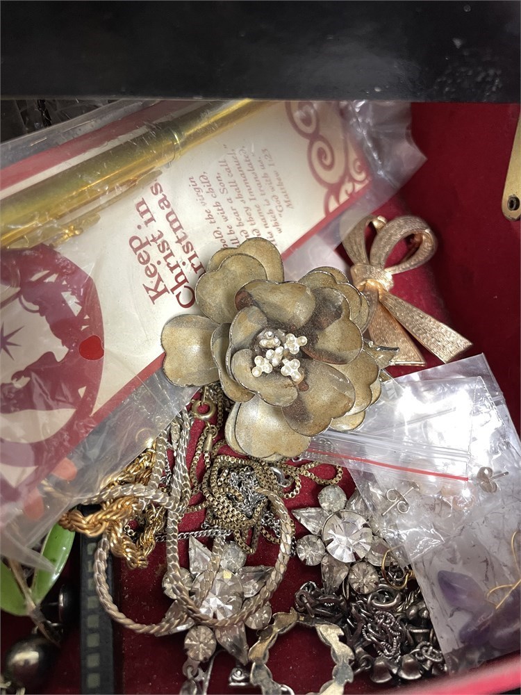 Assorted costume jewelry, plus the box (which is only fair condition).  Lots to look through, for better or worse, some wearable, most of it older, some just misc.