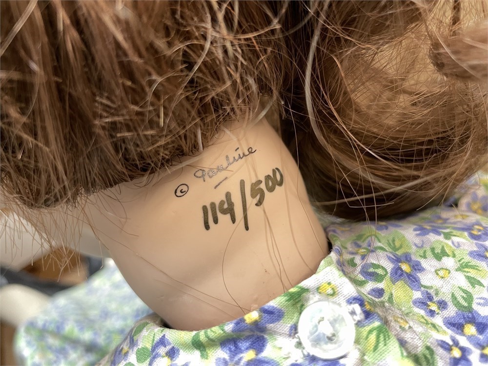 "Pauline" dolls; 2 are cloth and made by Applause.  2 are extra-large porcelain dolls with cloth bodies, numbered on the neck; and these need some TLC cleaning.  Also a medium sized porcelain Pauline doll in good condition.