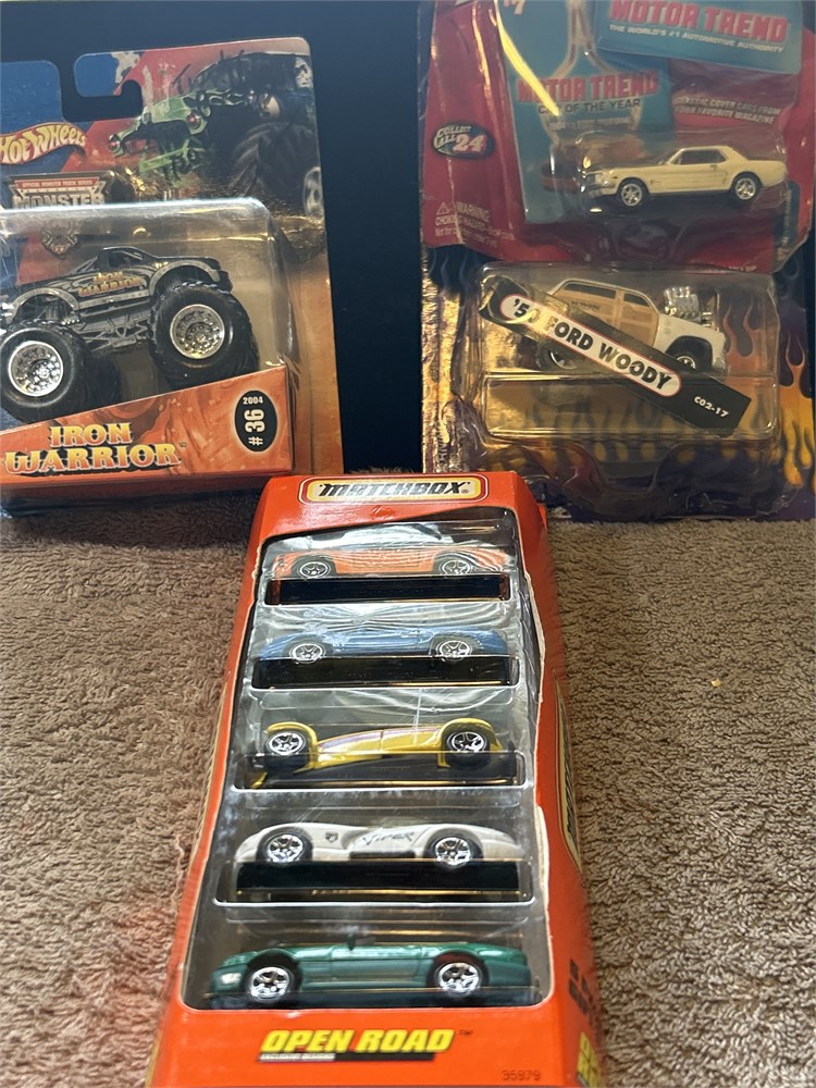 Monster truck iron  warrior New motor trend Johnny lighting 1964 1/2 mustang Muscle machine, 54 woody matchbox open road five cars, Camaro wiper Mustang and