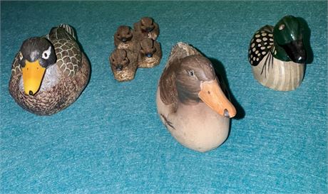The wooden ducks include a 4 ducklings measuring 6” long, a brown duck (unsure of species) measuring 6” long, had interesting detail from the wood used to carve it, and what appears to be a spotted loon measuring 4” long with the makers stamp “Wabash River Decoys, Indy John” on the bottom.