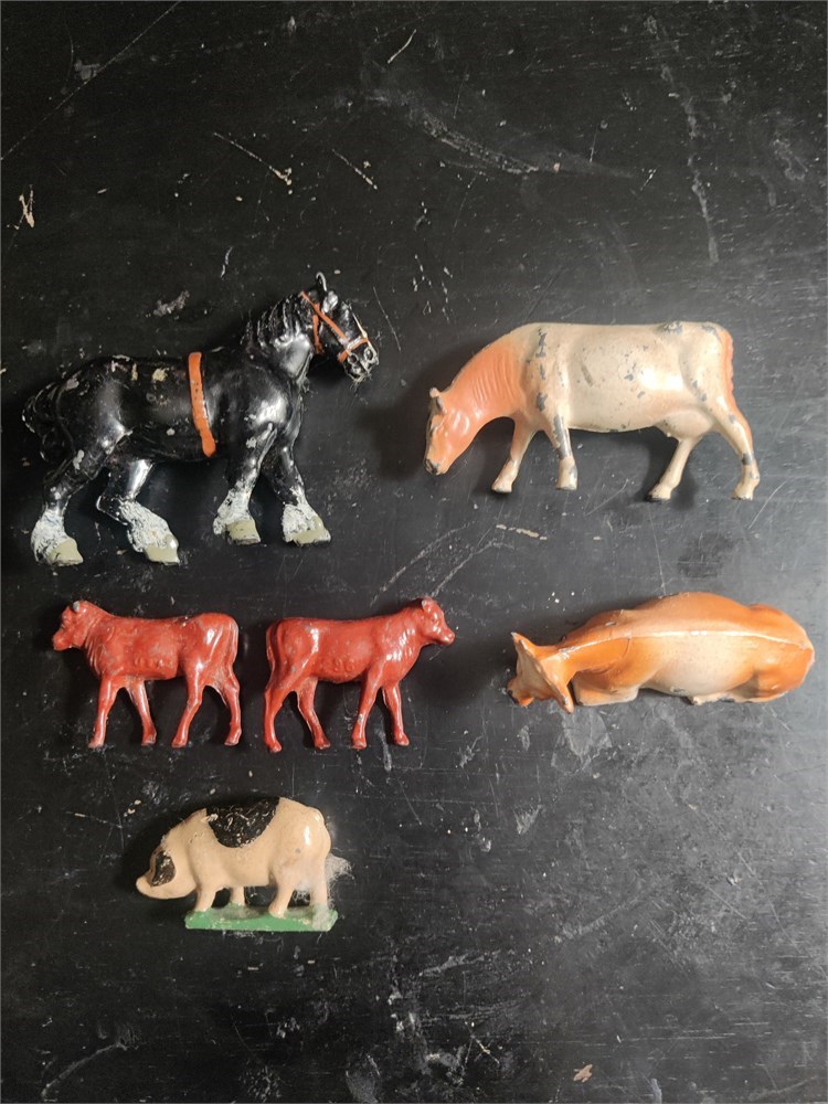 Vintage j Hill and Company metal farm figures. Includes six animals. I believe these are from the 1950s. The figures have some paint loss figures are in good condition. The black horse is Britain's.