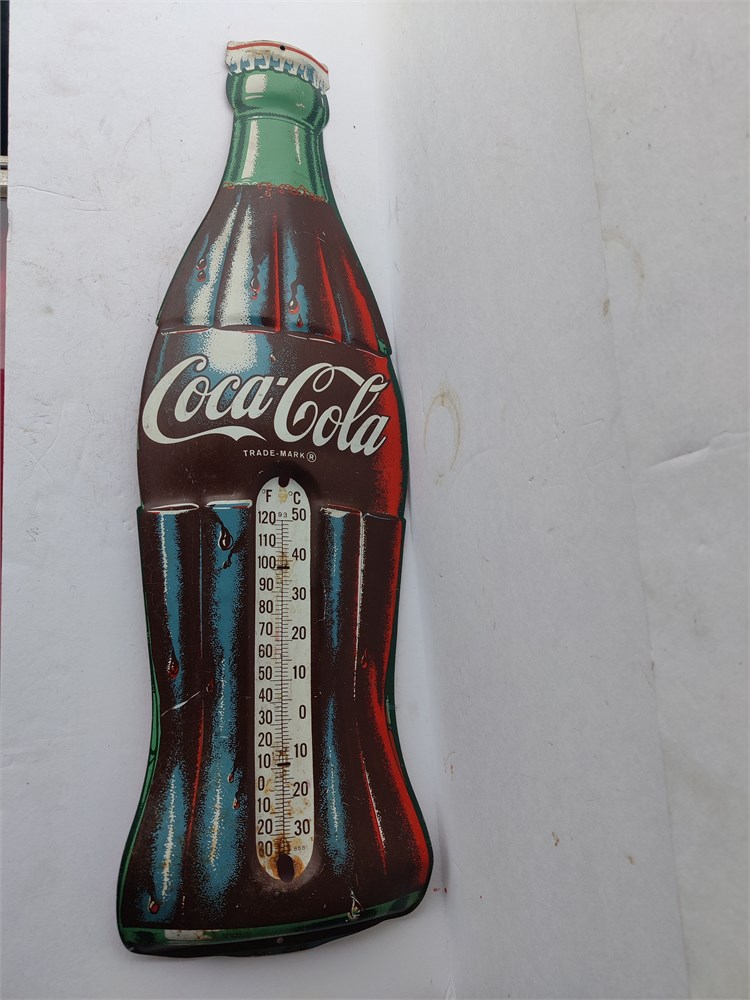 Vintage Coca-Cola metal thermometer. The Mercury tube is missing off the thermometer. The sign itself measures 24 in tall and is approximately 9 in wide.