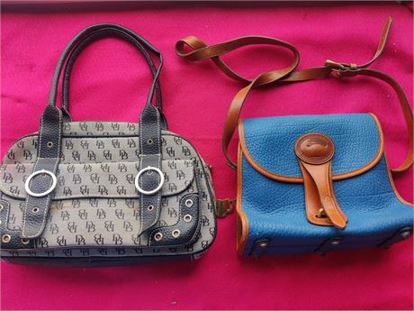 Two Dooney & Bourke purses. One is all weather leather blue and brown knees a little clean up The other is a canvas Dooney & Bourke and does have some staining so please look at pictures so see condition.