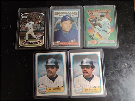 Baseball cards five card lot. Includes  Alex Rodriguez Topps 2005 Fanfest, Card 5. Also includes refractors of Greg Maddux and Darryl Hamilton. Plus two 1981 Fleet Reggie Jackson cards. One Reggie Card is an error card.