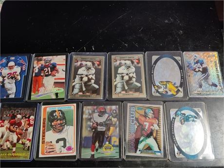 Nice lot of 11 football cards. All cards are in very good condition. Include some refractors and numbered cards. Includes Emmitt Smith, Terry Bradshaw, Berry Sanders, John Elway, and a few others.