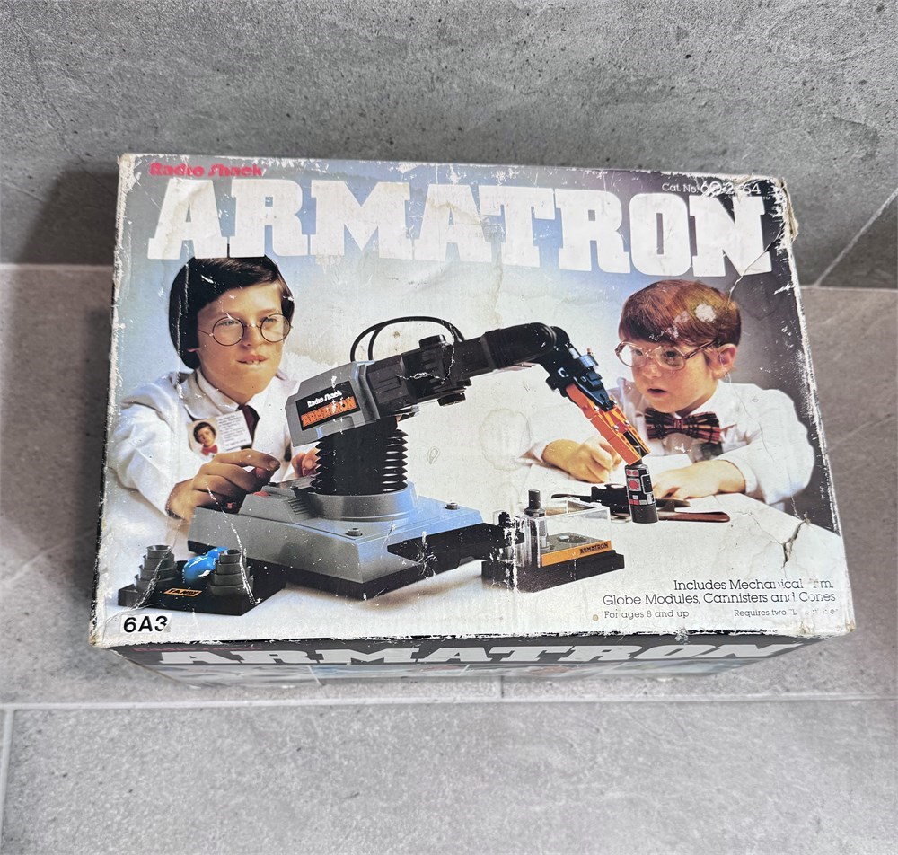 1980s Radio Shack Armatron with box. Box is worn but toy still in excellent shape and in working condition. Has batteries, but missing the accessories. What you see is what you get. Add some nostalgia to your collection!