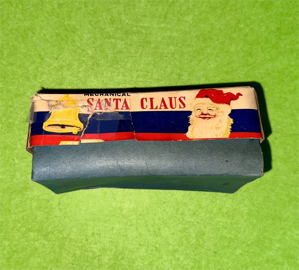 7.5” tall Vintage Mechanical Santa. Winds up and works. Comes with box. Worn condition.
