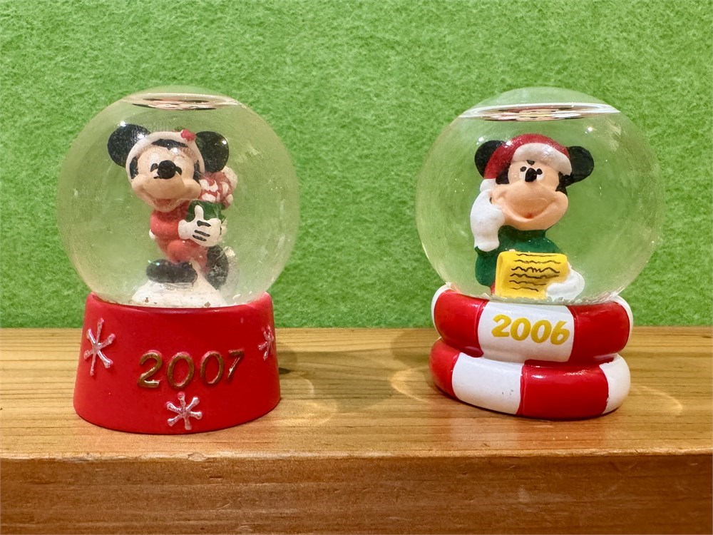 Years 2006 & 2007 collectible Disney Mickey Mouse miniature snow globes. A JC Penny Black Friday tradition. Good condition. 2.5” tall.