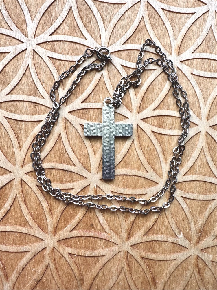 Blue and silver metal cross pendant with a vine detail on a cable chain necklace. Pendant Measures 1 1/4" chain is 10"