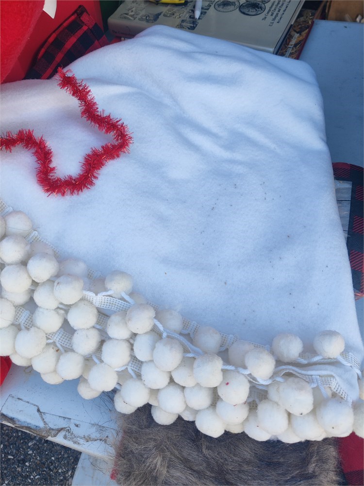 Large tote of nice Christmas decorations. Looks like an includes some very large stockings placemats additional decorations napkins tree skirt ribbons and much much more.