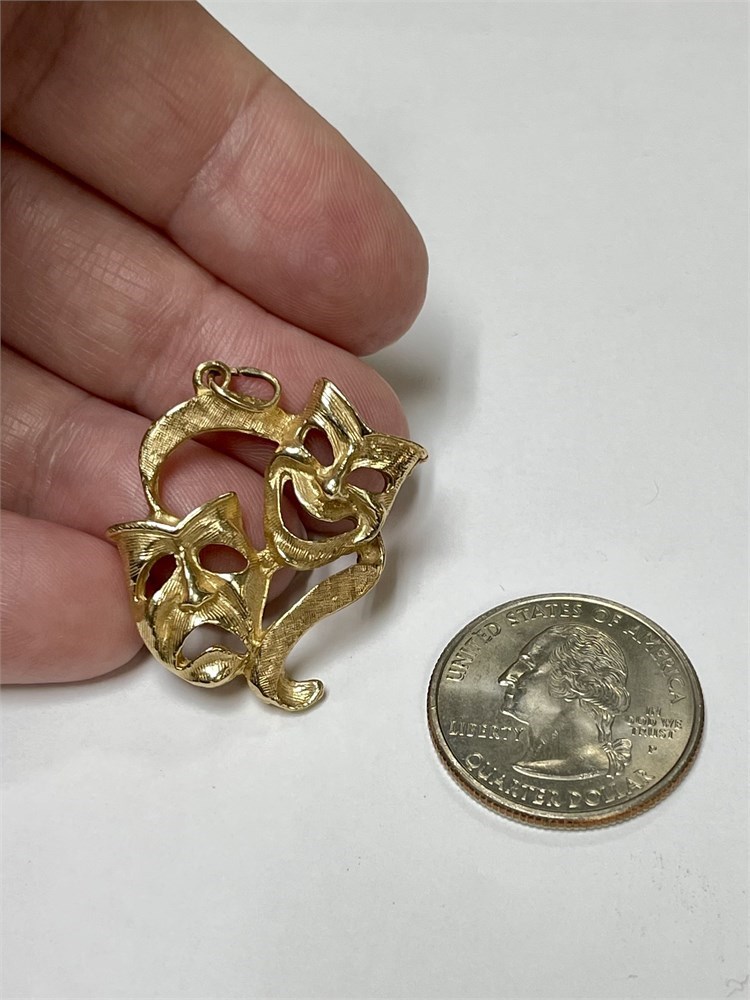 A classic theme for theater lovers, made from 14K yellow gold.  Unmarked but tested.