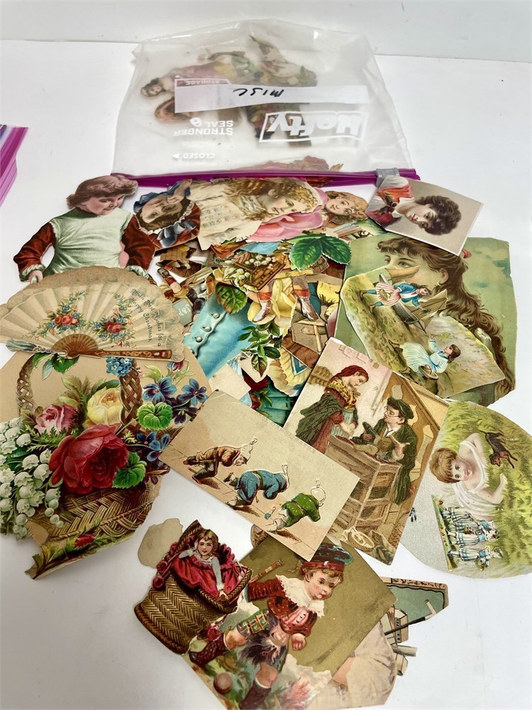 Collectible paper goods, virtually all from the Victorian era including advertising and trade cards, clippings, greetings, other items, a big assortment of antique ephemera.