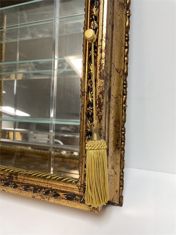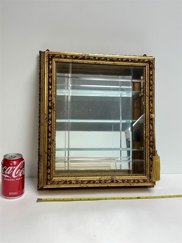 A quality wall-mounted display for your smaller collectibles.  The glass shelves are about 2 1/4" deep.  It's a pretty cabinet with beveled glass front, mirror, gilt wood framing, even a tassel.